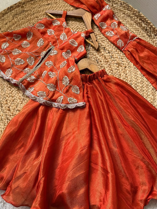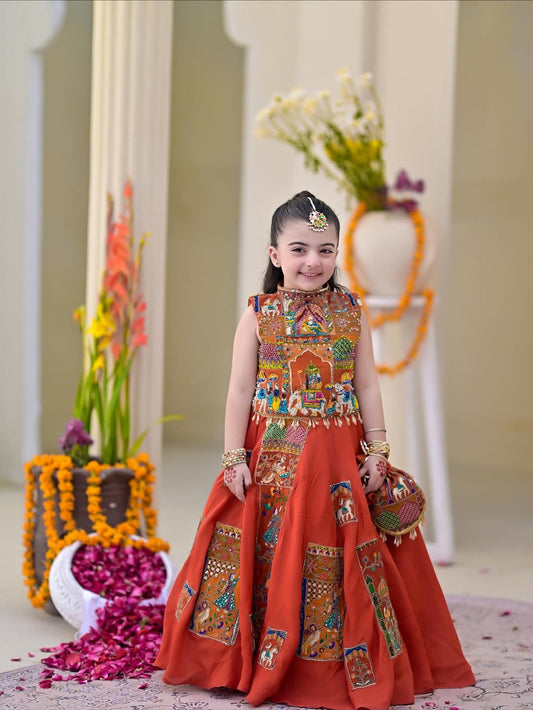 Royal Rust Orange Patchwork Lehenga Choli Set for Girls