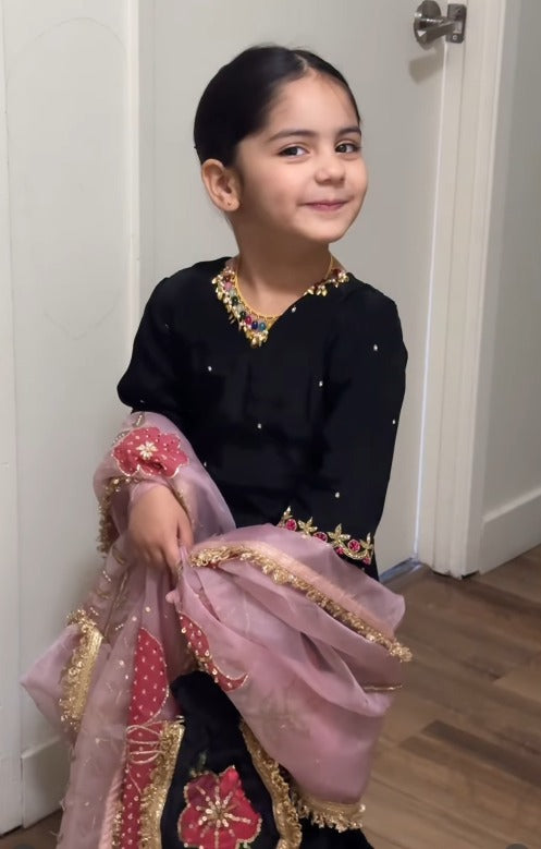 Black & Pink Embroidered Sharara Set for Girls